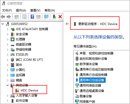 使用USB数据线连接PC机与测试机,但未识别HDC设备。