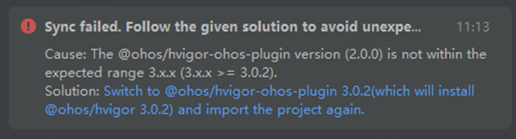 若还出现如下提示,直接单击蓝色文字,切换hvigor版本即可。