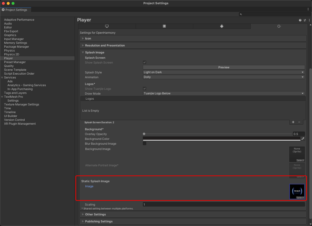 其中"name": "ShowStaticSplashScreen"字段表示是否显示此启动页面,显示的图像路径为src/main/resources/base/media/app_splash.png"name": "StaticSplashScreenFit"字段表示是否调整该图片的大小以填充目标平台的屏幕大小。