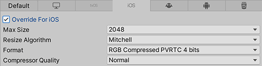纹理Texture的设置关乎平台的特性设置,设置详情请参见Texture Import Settings官方文档。设置纹理Texture会影响到最终构建的包体大小,若不对HarmonyOS平台特定设置,会发现Hap包相对于APK包的体积大很多。